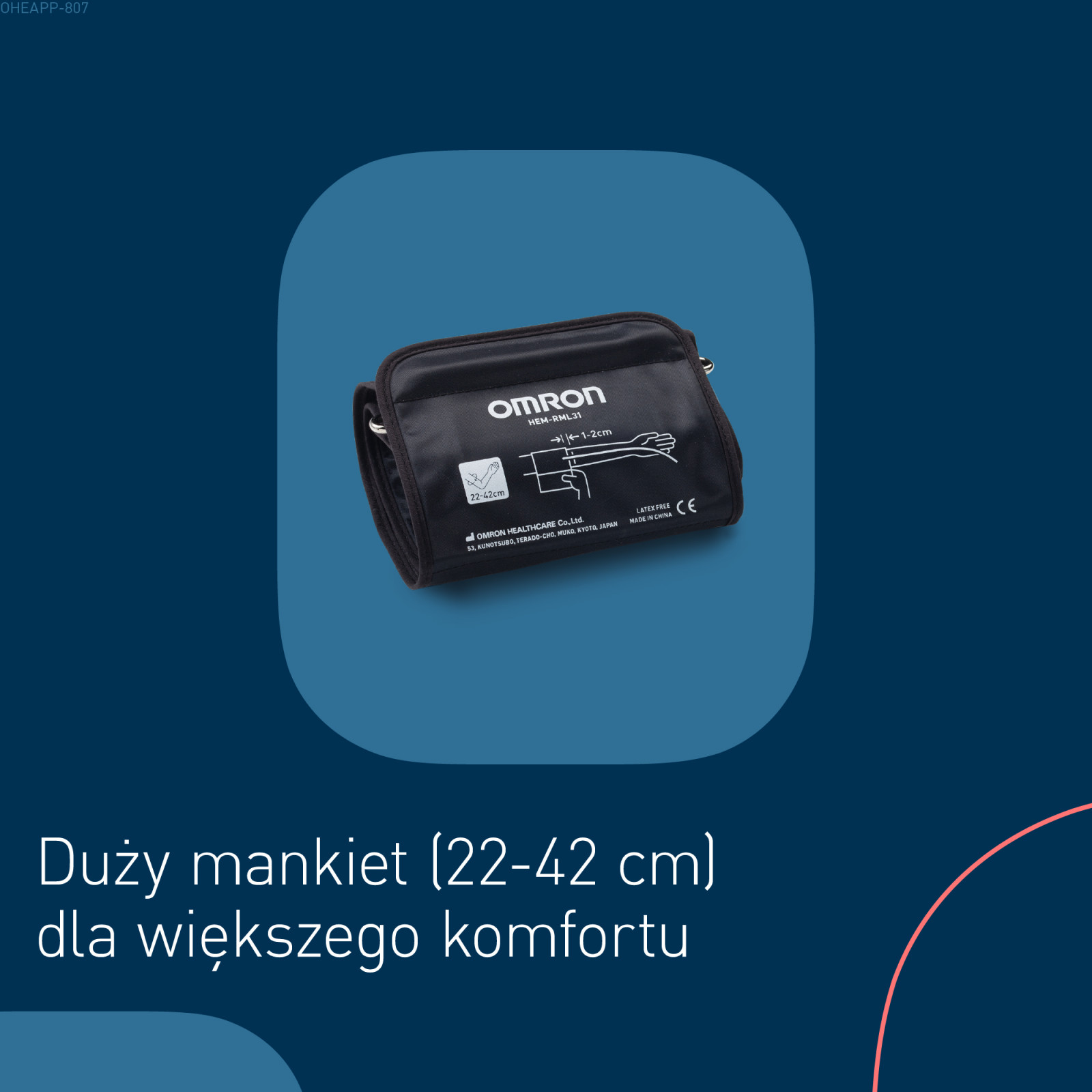 Uniwersalny mankiet (22–42 cm) pasuje na szeroki zakres obwodów ramienia i zapewnia dokładne wyniki niezależnie od sposobu założenia. Wykrywanie nieregularnego rytmu serca oraz ruchu ciała pomaga zmniejszyć błędy i zwiększyć wiarygodność każdego pomiaru.