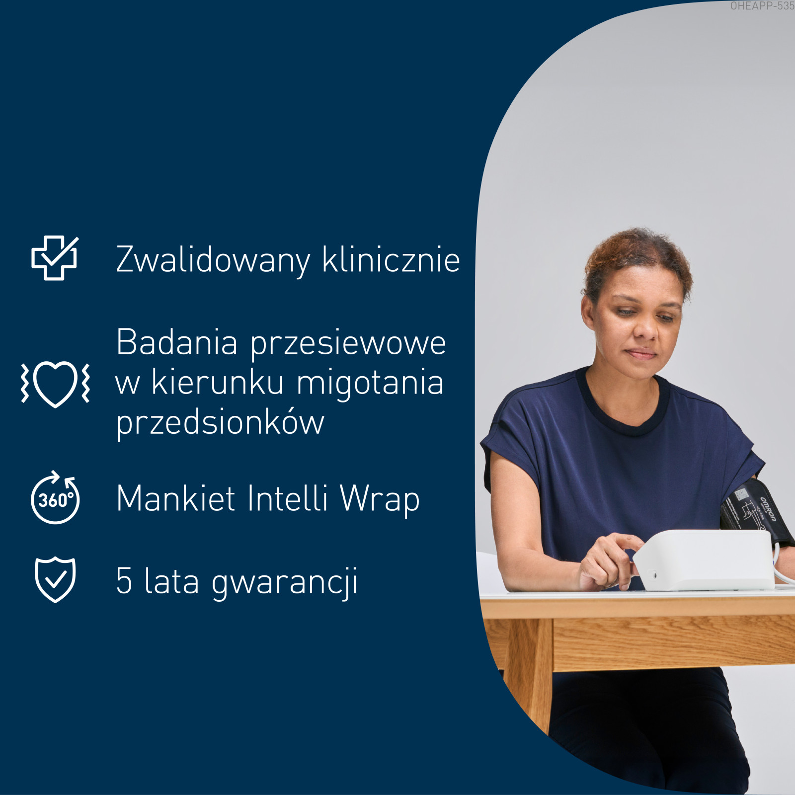 Za jednym naciśnięciem przycisku, automatycznie sprawdzaj AFib za każdym razem, gdy mierzysz ciśnienie krwi. Zmaksymalizuj korzyści płynące z regularnego monitorowania, pomóż zapobiegać poważniejszym powikłaniom i uzyskaj bardziej kompleksowy przegląd stanu swojego serca, zmniejszając stres związany z niepewnością.